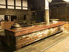 一つの釜で約七斗(98キログラム)のご飯を炊くことができる大釜が三基並んでいます。三つで一度に二石(約2,000人分)のご飯を炊いたものです。昭和50年代まで、年末の餅つきの際に使われていました。二石釜の真上には行灯が釣られ、正面には台所の神様である三宝荒神をおまつりしています。