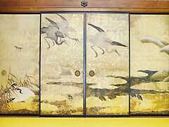 【重要文化財 本坊】大広間は重要な儀式・法要が執り行われる処で、2月の常楽会(じょうらくえ 涅槃会)や4月の仏生会(花祭り)等がここで行われています。襖には群鶴(ぐんかく)の絵、松の絵が描かれ、斎藤等室(さいとうとうしつ 1588年~1668年)の筆と伝えられています。