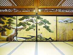 襖の絵は、雪舟様として名高い雲谷等益(うんこくとうえき 1590年~1644年)と、その息子の雲谷等爾(うんこくとうじ 1615年~1671年)の筆によるものと伝えられています。この場所は、上段の間と共に昔は高野山最高のお部屋でした。