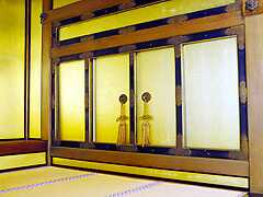 この上段の間には上々段の間と装束の間があり、壁は総金箔押しであり、天井は折上式格天井(おりあげしきごうてんじょう)の書院造りの様式になっています。上段右側にある小さな房の着いた襖は「武者隠し」といい、襖の向こうには一室の部屋があります。