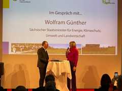 Zum Auftakt sprach Moderatorin Katrin Fahrenkrug mit dem sächsischen Staatsminister für Energie, Klimaschutz, Umwelt und Landwirtschaft Wolfram Günther unter anderem darüber, welche Initiativen es seitens des Freistaates bereits gibt, um regional erzeugte Lebensmittel auch in der Region weiterverarbeiten und vor allem verkaufen zu können, welche Maßnahmen zur Stärkung regionaler Wertschöpfung vom Landwirtschaftsministerium angeschoben sind oder noch angeschoben werden sollen. Wolfram Günther ging danach auch in den direkten Dialog und beantwortete geduldig die Fragen der Zuhörerinnen und Zuhörer.
