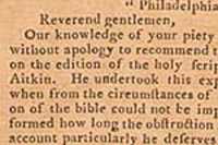 The war with Britain cut off the supply of Bibles to the United States with the result that on Sept. 11, 1777, Congress instructed its Committee of Commerce to import 20,000 Bibles from "Scotland, Holland or elsewhere." On January 21, 1781, Philadelphia printer Robert Aitken (1734-1802) petitioned Congress to officially sanction a publication of the Old and New Testament which he was preparing at his own expense. Congress "highly approve the pious and laudable undertaking of Mr. Aitken, as subservient to the interest of religion . . . in this country, and . . . they recommend this edition of the bible to the inhabitants of the United States." This resolution was a result of Aitken's successful accomplishment of his project.