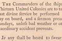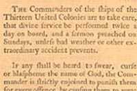 Congress particularly feared the navy as a source of moral corruption and demanded that skippers of American ships make their men behave. The first article in Rules and Regulations of the Navy (below), adopted on November 28, 1775, ordered all commanders "to be very vigilant . . . to discountenance and suppress all dissolute, immoral and disorderly practices." The second article required those same commanders "to take care, that divine services be performed twice a day on board, and a sermon preached on Sundays." Article 3 prescribed punishments for swearers and blasphemers: officers were to be fined and common sailors were to be forced "to wear a wooden collar or some other shameful badge of distinction."