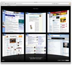 Lastly and most superficially, the Bookmarks window now offers CoverFlow views of all the pages in a given folder. This is certainly nice to look at, but isn’t any more helpful than the old text list (still available beneath the CoverFlow window). Pages you haven’t visited recently get a blank placeholder icon instead of a recent snapshot, so you mostly end up looking at a stream of glossy black squares.