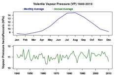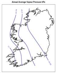 Vapour pressure is calculated at synoptic weather stations at each hour for which observations are made. The average annual vapour pressure over Ireland and the mean annual and mean monthly vapour pressure at Valentia Observatory are displayed below.