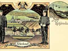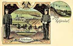The “Bahnschacht” mine (top right), and the “Anna-Schacht” (bottom left) of the “Consolidirte Ruben-Grube” mine (later KWK Pole Piast), in 1900. Vintage artist polychrome lithography postcard, published by Wittwer & Ermer, Neurode.G. Grundmann collection.