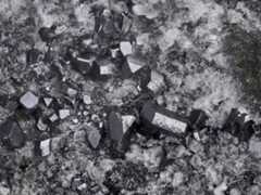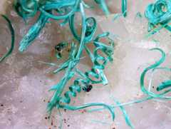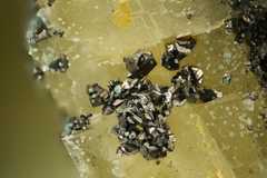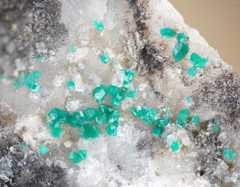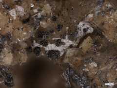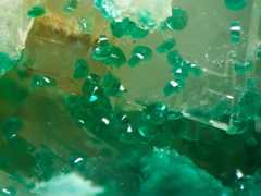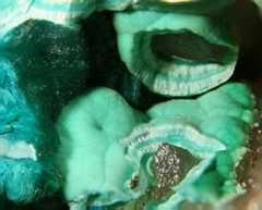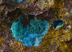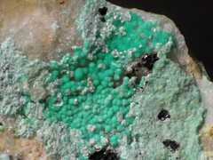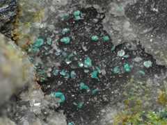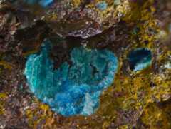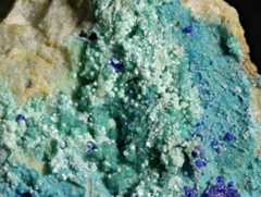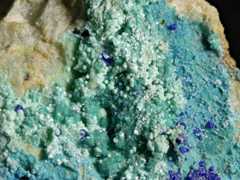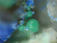 Pale turquoise theisite spherules (PXRD-analysed), with some azurite. Width of photo 5 mm.Found by Tobias Schachinger.This photo was originally published in Kolitsch, U., Schachinger, T. & Brandstätter, F. (2010): 1649) Aragonit, Theisit, Zinkolivenit und ein neues Cu-Zn-As-(S)-O-H-Mineral vom Bergbau Ottneralm (Traholz), Brixen im Thale, ...