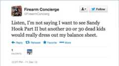Three days before the anniversary of the massacre in December, Redditor and gun dealer FirearmConciergeput it this way on Twitter: “Listen, I’m not saying I want to see Sandy Hook Part II but another 20 or 30 dead kids would really dress out my balance sheet.”