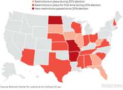 A month after the Supreme Court ruling, North Carolina passed asweeping rewrite of its election laws, requiring voter IDs, cutting early voting, and eliminating same-day registration, among other changes, before the law was struck down in a federal court for targeting black voters “with almost surgical precision.” Ohio repealed the first week of early voting, when African Americans werefive times likelierthan whites to cast a ballot. Floridabarred ex-felons from becoming eligible to vote after serving their time, preventing 1.7 million Floridians from voting in 2016, including 1 in 5 black voting-age residents.Arizona made it a felony for anyone other than a family member or caregiver to collect a voter’s absentee ballot, disproportionately hurting Latino and Native American voters in the state’s rural areas.