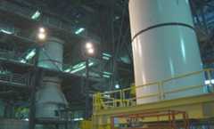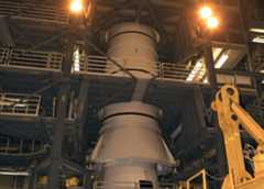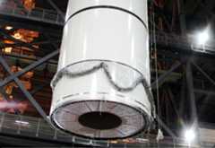 The rolled up plastic environmental enclosure, as seen around the bottom end of a Shuttle booster segment being lifted in the VAB Transfer Aisle in 2004. Credit: NASA
