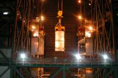 A crane lifting a Shuttle booster segment in the VAB in 2004 after clearing the 16th floor crossover into High Bay 3. Credit: NASA