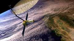 SweepSAR, developed by JPL and German Space Agency engineers, works by bouncing a transmitted narrow beam of microwave energy off of the antenna’s large reflector, illuminating an entire 242 km swath on the ground. The signals that strike the ground return to the spacecraft at slightly different times, depending on the nature of the surface.