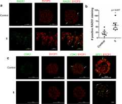 For immunofluorescent staining of chromosome spreads, slides were washed with PBS (Thermo Scientific) and 0.015% Triton X-100, blocked with 5% bovine serum albumin (Sigma-Aldrich) in PBS at room temperature for 1 h, and then incubated with anti-CDK2 monoclonal antibody (sc-6248, Santa Cruz Biotechnology,1:100) or anti-SPY1 R55A antibody17 (1:1) and anti-SYCP1 polyclonal antibody (NB300-229, Novus, 1:100), or anti-RAD51 polyclonal antibody (pc130, Millipore, 1:100) and anti-SYCP-3 monoclonal antibody (sc-74569, Santa Cruz Biotechnology, 1:100) overnight at 4 °C. Fluorescence was developed using Alexa Fluor 488 and 564 conjugated secondary antibodies (ab150073, Life Technologies, 1:250). A Nikon Eclipse TiE inverted microscope with A1R-SHR confocal was used for imaging. RAD51 localization was quantitively assessed by determining the number of positive staining sites on the chromosome and telomeres per cell for 6 samples per group. An unpaired two-tailt-test withp < 0.05 was used to determine significance. CDK2 and SPY1 staining was qualitatively assessed through abnormal or normal scoring for 17 control samples and 6 samples treated with compound5, where an abnormal score was given if 3+ telomeres within the sample did not stain positive for CDK2 or SPY1. The same anti-CDK2 antibody was used for Western blot with anti-β actin antibody (Genscript, cat. # A01865) as an internal control.