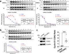 For both Jurkat and OVCAR3 cell lines, 0.5 and 1 million cells were lysed in 100 mL RIPA buffer (Thermo Scientific) containing PhosSTOP phosphatase inhibitor cocktail (Roche) and complete protease inhibitor cocktail (Roche). Lysate was centrifugated at 11,000 × g for 10 min at 4 °C. Cell debris was removed and the total protein concentration normalized by a BCA assay (Pierce BCA Protein Assay Kit, Thermo Scientific). The proteins were electrophoresed on a 4–12% Bis-Tris NuPage gradient gel (Invitrogen) and transferred to a low fluorescent polyvinylidene difluoride membrane (Bio-Rad). Immunoblots were conducted with anti-cyclin E1 (#4129, Cell Signaling Technology, 1:2000), anti-CDK2 (sc-6248, Santa Cruz Biotechnology, 1:2000), and anti-β-actin (A1978, Millipore Sigma, 1:2,000) followed by secondary horseradish peroxidase-conjugated-goat-anti-mouse (A16072, Invitrogen, 1:1,000 for cyclin E1 and CDK2 blots) and Alexa680 conjugated-goat-anti-mouse (A32729, Invitrogen, 1:1,000 for β-actin blots) antibodies. When using horseradish peroxidase-conjugated secondary antibody, West Femto Maximum Sensitivity Substrate (Thermo Scientific) was added to the membranes before imaging on an Odyssey Fc Imaging system (Li-Cor). Band intensity was quantified with ImageJ 1.53a and plotted in GraphPad Prism 9.3.0. Experiments were performed four times with two different cell amounts (0.5 and 1 million cells); data were aggregated to yield 8 replicates. Unpaired two-sided student’st test without adjustments was conducted to determine significance in GraphPad Prism.