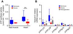 We found reduced ATP synthase activity in the crucian carp heart but not in red skeletal muscle (Fig. 3A). To investigate whether ATP synthase could be suppressed at the mRNA level, we cloned, sequenced and performed qPCR on selected members of the F1 subunit of the ATP synthase: assembly factor for the alpha and beta subunit (ATPAF2 and ATPAF1, respectively) and the gamma subunit (ATP5C1). The level of ATP5C1 mRNA expression was reduced in anoxic hearts but not in red skeletal muscle (Table S1). For the F0 subunit, we investigated subunit C and found mRNA expression of five paralogues (ATPF0CA,ATPF0CB,ATP5g1a,ATP5g1b andATP5g3a) of which all were downregulated in anoxic hearts (Fig. 3B), but not in red skeletal muscle (Table S1). Subunit C of ATP synthase has been suggested to be the pore forming unit of mitochondrial permeability transition pore (MPTP) that mediates cell death (Carraro et al., 2020). For the F0 e-subunit, we found four paralogues of which two showed reduced mRNA expression levels in anoxic hearts but not in red skeletal muscle (Table S1). An important regulator of mammalian ATP synthase activity is inhibitory factor 1 (IF-1). However, mRNA expression levels of the two paralogues of IF-1 that we found (IfA andIfB) were not significantly altered in the heart or red skeletal muscle of crucian carp during anoxia (Table S1).