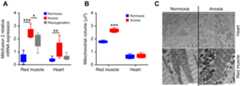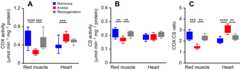 As the abundance and morphology of mitochondria during anoxia appeared unaffected, we investigated COX activity in red skeletal muscle and cardiac tissues from crucian carp exposed to normoxia and 1 week of anoxia. We found an increase in COX activity in the heart and a reduction in the red skeletal muscle of the anoxia group (Fig. 5A). In the red skeletal muscle, CS activity was reduced during anoxia, while we found no change in the heart (Fig. 5B). Consequently, 1 week of anoxia induced an increase in the COX/CS ratio in hearts, while it led to a reduction in the red skeletal muscle (Fig. 5C).