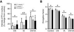 Crucian carp cardiomyocyte viability and length/width relationship in response to inhibition of oxidative phosphorylation and glycolysis. (A) Cell viability, assessed as the intensity of propidium iodide (PI) in nuclei, in isolated cardiomyocytes exposed to increasing doses (0.1, 1 or 10 mmol l−1) of the complex IV inhibitor sodium cyanide (CN), the glycolysis inhibitor iodoacetate (IA) or CN+IA in combination. (B) Elongation factor of cardiomyocytes following complex IV (CN treatment) and/or glycolysis (IA treatment) inhibition. A decrease in elongation factor indicates hypercontracted and less functional cardiomyocytes. Data are means±s.e.m. (n=5). Statistical differences were investigated with a two-way ANOVA, with Holm–Šidák'spost hoc test. Different letters denote a significant difference between treatments (P<0.05). Asterisks denote a significant difference from controls for a given concentration within a treatment (*P<0.05).