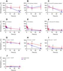 Normalised mitochondrial membrane potential (ψm) of isolated cardiomyocytes from rainbow trout and crucian carp exposed to blockers of the electron transport system (ETS) and the uncoupler CCCP. Data (means±s.d.,n=6 for each species) were normalised to control cell ψm measured at each point. (A) Complex IV inhibition with 1 mmol l−1 sodium cyanide. (B) ATP synthase inhibition with 30 nmol l−1 oligomycin A. (C) Complex IV and ATP synthase inhibition with a combination of 1 mmol l−1 sodium cyanide and 30 nmol l−1 oligomycin. (D) Complex I inhibition with 5 µmol l−1 rotenone. (E) Complex III inhibition with 5 µmol l−1 antimycin A. (F) Complex I, III and IV inhibition with combined 5 µmol l−1 rotenone, 5 µmol l−1 antimycin A and 1 mmol l−1 sodium cyanide treatment. (G–J) Uncoupling of the proton gradient with increasing concentrations of CCCP: 5 nmol l−1 (G), 50 nmol l−1 (H), 500 nmol l−1 (I) and 5 μmol l−1 (J). Statistical differences were investigated with a two-way ANOVA, with Holm–Šidák'spost hoc test (*P<0.05, **P<0.01, ****P<0.0001).