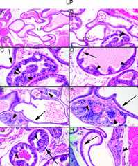 Preparation and analyses of tissues for prostate histopathology Individual 1868 FLiMP+/- and FLiMP+/+ male mice were sacrificed from 6 to 35 weeks of age and examined for gross organ abnormalities. The urogenital tract was removed intact, and the tissues were dissected to remove the bladder and associated fats. The tissues (including all prostate lobes, and the seminal vesicles) were fixed in buffered formalin. The urogenital tract, including the bladder, seminal vesicles, prostate (dissected dorsolateral, ventral, and anterior lobes), testes, and epididymides, were removed on necropsy en bloc and prepared for pathological evaluation, as described below. For histology, the prostate was treated with an acid alcohol solution, as described by Folkvord et al. [38]. Fixed tissues were embedded in paraffin, and sections were stained with hematoxylin and eosin (H&E) [39]. Prostate lesions were assessed according to the consensus classification of the MMHCC (October 2000; Bar Harbor, ME) by two independent pathologists (A.V.P. and S.B.S.) who were blinded to the genotypes of the animals [32].