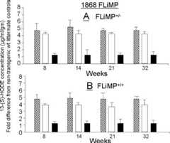 ), ventral (□), and anterior (■) prostate lobes, each from three transgenic C57BL/6, FLiMP+/- (A), and FLiMP+/+ (B) mice at 8, 14, 21, and 32 weeks of age, were compared to age-matched nontransgenic C57BL/6 littermate wt control proteins that were similarly extracted and pooled.