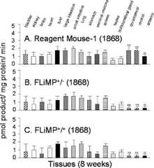 CAT screening of tissues from REAGENT transgenic male founder, and FLiMP+/- and FLiMP+/- transgenic mice at the 8-week time point (n = 4 each). Tissues were collected and used immediately, or frozen and stored at -80° C. Each tissue was individually homogenized and heated, and the supernatant was used for CAT and protein determination assays. The concentration of soluble protein was determined by BioRad protein assay. The percentage of [14C]chloramphenicol converted to acetylated forms was determined by scraping individual spots with TLC and by counting in a scintillation counter. CAT activities are expressed as picomoles of acetyl chloramphenicol generated per minute per milligram of protein, after subtracting the background for each tissue from control mice that do not express the CAT gene. Specific activity was calculated as picomoles of product per milligram of protein per minute. ***P < .01; **P < .05.