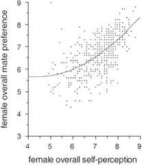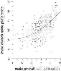 We tested the hypothesis that the mate preference of an individual would be contingent on his/her self-perception. We predicted that mate-preference scores would be positively related to self-perception scores. For females and males separately, we conducted linear and second-order polynomial regression analyses, with overall mate-preference score as the dependent variable and overall self-perception score as the independent variable.