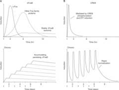 Distinct temporal properties of drug regulation of ΔFosB vs. CREB. (A) ΔFosB. The top graph shows several waves of Fos family proteins (comprised of c-Fos, FosB, ΔFosB [33 kD isoform], Fra1, Fra2) induced in nucleus accumbens by acute administration of a drug of abuse. Also induced are biochemically modified isoforms of ΔFosB (35-37 kD); they are induced at low levels by acute drug administration, but persist in brain for long periods due to their stability. The lower graph shows that with repeated (e.g., twice daily) drug administration, each acute stimulus induces a low level of the stable ΔFosB isoforms. This is indicated by the lower set of overlapping lines, which indicate ΔFosB induced by each acute stimulus. The result is a gradual increase in the total levels of ΔFosB with repeated stimuli during a course of chronic treatment. This is indicated by the increasing stepped line in the graph. (B) CREB. Activation of CRE transcriptional activity, mediated via phosphorylation and activation of CREB and possibly via the induction of certain ATFs, occurs rapidly and transiently in nucleus accumbens in response to acute drug administration. This "peak and trough" pattern of activation persists through chronic drug exposure, with CRE transcription levels reverting to normal within 1-2 days of drug withdrawal.