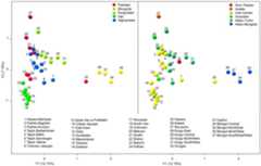 First and second axes of the Factorial Correspondence Analysis are represented inFigure S6. First and second axes account respectively for 13.27% and 10.70% of the total variance. Axis1 is mainly driven by East Eurasian (such as C, D, F, G) and South Asian haplogroups (macrohaplogroups M and U2). The second PC is driven by East and West Eurasian haplogroups. The general overview offers a triangular distribution of the populations; linguistic and geographical assignations have been highlighted.