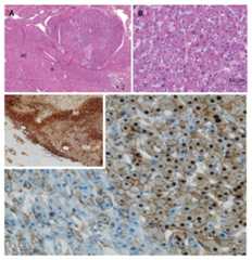β-catenin mutated adenomas (from different cases). A: This tumor is composed of 2 parts: an adenoma (ad) and a hepatocellular carcinoma (white asterix) (HE); B: In this adenoma, some irregular nuclei and acinar arrangements are seen (white arrow) (HE); C: immunohistochemistry: cytoplasmic and nuclear overexpression of β-catenin in adenoma (ad), contrasting with normal membranous staining in adjacent non tumoral liver (NT); Inset (upper left): homogeneous immunostaining with glutamine synthetase in adenoma (ad), contrasting with normal staining of pericentral hepatocytes (lower left).