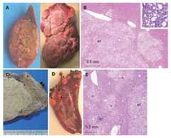 HNF1α-mutated adenomas (from different cases). A: left: single, yellowish HCA; right: a massive form involving the whole right lobe made of several numerous adjacent nodules of different sizes; B: typical aspect of a steatotic HCA (ad) with a lobulated contour. Inset: HCA at a higher magnification showing macro and microvesicular steatosis (HE); C: left: part of a large focal nodular hyperplasia (indication of surgery), nearby small adenomas (arrows) discovered by chance on the surface of the liver (corresponding to a somatic HNF1α-mutated adenomatosis). D: several yellow microadenomas in a somatic HNF1α-mutated adenomatosis; E: multiple not well limited steatotic microadenomas (asterix) nearby a larger adenoma (ad) in a patient with a constitutional HNF1α-mutated adenomatosis.