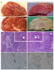Inflammatory/telangiectatic adenomas (from different cases). A: several sections of adenomas showing different aspects. Upper left: hemorrhagic areas in the center of the tumor; lower left: several micronodules (white arrows) in a patient with a large inflammatory/telangiectatic adenoma (not shown); upper right: this massive adenoma is difficult to identify on fresh tissue; the same is more easily identified after fixation (lower right); B, C and insets: typical aspects with obvious telangiectasia and inflammatory infiltrates (B) around thick arteries (C) (HE); D: some ductular reaction is visible on cytokeratin 7 immunostaining; E: CD34 immunostaining highlights capillarized sinusoids around arteries.