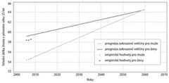 Dále předpokládáme, že úmrtnost ve vyšším věku nadále odpovídá Gompertzovu zákonu, jak bylo ukázáno v předchozí části. Zároveň nebudeme přistupovat k zakončení úmrtnostní tabulky v nějakém předem pevně určeném věku (např. 110 let), jak je běžně činěno v demografických prognózách. V našem přístupu se věk posledního úmrtí ve studované populaci posouvá do vyššího věku jako důsledek pokračujícího poklesu úmrtnosti. S přihlédnutím ke všem uvedeným předpokladům byly konstruovány prognózy úmrtnosti pro příštích 50–60 let.