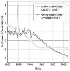 kdeμx značí intenzitu úmrtnosti (rizikovou funkci) ve věkux,α aR0 jsou parametry tohoto vztahu. Uvedený vztah popisující úmrtnost osob starších 20 let je označován jako Gompertzův zákon a jeho parametry pak jako Gompertzovy parametry. V pozdější době začal být Gompertzův zákon hojně užíván pro popis úmrtnosti laboratorních zvířat (Gavrilov – Gavrilova, 1991).