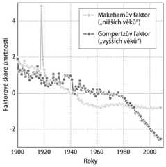 Parametrická vyjádření jsou využitelná v populačních projekcích díky analýze historických trendů vývoje uvažovaných parametrů. Například v publikaci z roku 1979 se v podobné analýze historických změn vývoje úmrtnosti švédských mužů ukázalo, že na věku závislá složka úmrtnosti v Gompertz-Makehamově vztahu vykazovala překvapivou historickou stabilitu navzdory rychlému poklesu na věku nezávislé složky (Makehamova členu) (Gavrilov – Gavrilova, 1979). Další detailnější analýzy potvrdily platnost tohoto jevu (Gavrilov – Gavrilova, 1991;Gavrilov – Gavrilova – Nosov, 1983) a výzkum historických časových řad údajů o úmrtnosti ze 17 zemí umožnil formulovat závěr, že podobný vývoj byl relativně běžný (Gavrilov – Gavrilova, 1991).Graf 1 ukazuje vývoj celkové, backgroundové a senescenční úmrtnosti švédských mužů. Je patrné, že backgroundová složka úmrtnosti je jedinou složkou, která se ve studovaném časovém intervalu (1900–1970) významně změnila. Senescenční úmrtnost (obsahující dva Gompertzovy parametry) se ukázala být prakticky neměnná navzdory prudkému poklesu celkové úrovně úmrtnosti během 20. století. Je možné pozorovat, že podstatné snížení měr úmrtnosti ve Švédsku na začátku 20. století je možné vysvětlit poklesem Makehamova členu, zatímco Gompertzova komponenta zůstala ve stejném časovém období prakticky konstantní. V 60. letech 20. století, když se Makehamův člen téměř přiblížil nulové hodnotě, se dalo předpokládat, že rychlý pokles úmrtnosti dospěl ke svému závěru. To je také to, co se skutečně v 60. letech stalo (Gavrilov et al., 1983). Tak na základě studia úmrtnostních tabulek pro první polovinu 20. století bylo možné předpokládat dosažení určitého “biologického limitu” intenzity úmrtnosti. Podobně na začátku 20. století byla například celková úroveň úmrtnosti v Norsku podstatně vyšší v porovnání s Dánskem. Ovšem na základě toho, že Gompertzova komponenta byla v Norsku zásadně nižší, bylo možné s poklesem Makehamova členu předpokládat vývoj směřující k vzájemně opačnému postavení obou států. A to je také přesně to, k čemu později došlo (Gavrilov – Gavrilova, 1991). Stejně tak v Itálii byly na začátku 20. století míry úmrtnosti mužů a žen v zásadě vyrovnané, ale nižší biologický limit v případě žen bylo možné doložit nižší hodnotou odpovídající Gompertzovy komponenty. Na základě dat z počátku 20. století tak bylo možné odhadovat, že s postupem času úroveň úmrtnosti žen poklesne pod hodnotu mužské úmrtnosti (Gavrilov – Gavrilova, 1991). Ovšem s koncem 60. let byly odstartovány neočekávané změny ve vývoji úmrtnosti. Tyto nové trendy nebyly ještě v okamžiku provádění uvedených studií dobře identifikovatelné, ačkoli již bylo možné zaznamenat první náznaky dalšího budoucího snižování úrovně úmrtnosti (Gavrilov – Gavrilova, 1991;Gavrilov – Nosov, 1985).