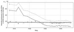 Pozn. překl.: Křivka 1 značí celkovou (pozorovanou) intenzitu úmrtnosti ve věku 40 let založenou na oficiálních švédských úmrtnostních tabulkách, křivka 2 pak její backgroundovou složku určenou na základě Gompertz-Makehamova zákona a křivka 3 senescenční složku ve věku 40 let vycházející opět z Gompertz-Makehamova zákona.