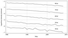 Pokud vezmeme v úvahu model posunu úmrtnosti, lze předpokládat, že úmrtnost po roce 1980 může být vyjádřena pomocí následujícího logaritmicko-lineárního modelu s podobným sklonem pro všechny dospělé věkové skupiny: