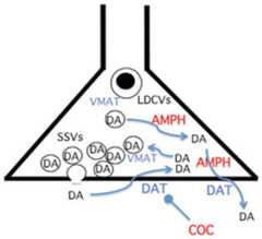 Cellular aspects of VMAT2 trafficking, expression, and targeting by drugs of abuse. Dual site of action of AMPH at the synaptic vesicle and at DAT, and single site of action of COC at DAT, are depicted. VMAT2 trafficking to SSVs and LDCVs is regulated in part by phosphorylation, and VMAT2 transport by G- protein coupling, through signal transduction pathways that are not yet characterized. TBZ binds directly to VMAT2 independently of its cellular location. See text for details.