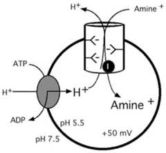 In 1962, Kirshner showed that reserpine and various so-called “indirectly acting sympathomimetic amines” (drugs like amphetamine [AMPH], phenylephrine, and ephedrine with norepinephrine-like pharmacological effects, but without action on adrenergic receptors) could block14C-epinephrine uptake into a particulate fraction from bovine adrenal medulla (the secretory granule). These experiments established the first molecular link between monoamine uptake into storage vesicles and psychotropic drug action.1 The study of monoamine uptake into storage granules was followed by an extensive characterization of the remarkable amine-accumulating properties of the vesicular monoamine transporter by the laboratories of Scarpa, Johnson, Henry, Schuldiner, and others, showing that the 10,000-fold accumulation was due to an ATP-driven proton gradient, and subsequent proton-monoamine exchange via transport facilitation2–6 (Fig. 1). Subsequently, the laboratories of Eiden and colleagues and Edwardset al. cloned the rodent and human monoamine transporters VMAT1 and VMAT2,7–9 the former found mainly in peripheral neuroendocrine cells and absent from all areas of the central nervous system, and the latter in monoaminergic neurons of the central and peripheral sympathetic nervous systems.10,11 VMAT1 and VMAT2 are members of the solute carrier superfamily and carry the designations Slc18a1 (VMAT1) and Slc18a2 (VMAT2) within that family.4 Fundamental insight into VMAT function can be gained by appreciation of its placement within a superfamily of proteins called TEXANs, for toxin-extruding antiporters.5,12 The vesicular neurotransmitter transporters evolved from bacterial antiporters that exchanged (extruded) cellular toxins in exchange for extracellular protons at the cellular membrane. Their role in vesicular transport represents essentially an “internalization and delayed extrusion” strategy for export of transmitter molecules (by exocytosis) that are in fact toxins (e.g., dopamine) if allowed to accumulate in the neuronal cytoplasm rather than being sequestered in storage vesicles.13–15