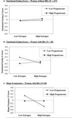 Nonetheless, follow-up models indicated that the interactive effects of estradiol and progesterone were also predictive of within-person changes in both types of dysregulated eating in women with BEs. As shown inFigures 3b and c, emotional eating scores and binge frequencies were elevated when both progesterone and estradiol levelswere low. This pattern was observed for emotional eating scores and binge frequencies, suggesting that the findings are robust and present across a range of dysregulated eating symptoms.