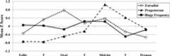 Mean Z Score = the mean of the 5-day rolling averages calculated within subjects, then averaged across participants; Follic = follicular phase; Ovul = ovulatory phase; Mid-lut = mid-luteal phase; Premen = premenstrual phase; T = transition days that are in-between phases. The number of days included in each phase varied by participant based on their cycle length, but the days roughly corresponded to the following (first day of menstrual bleeding = +1; previous day = −1): Follicular = +3 to +12; Ovulatory = −15 to −12; Mid-luteal = −9 to −5; Premenstrual = −3 to +1.