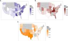 To quantify differences in African ancestry driving mean state differences, we examined the distributions of estimates of African ancestry in African Americans from the District of Columbia (D.C.) and Georgia, which had at least 50 individuals with the lowest and highest mean African ancestry proportions (Figure S1E). We find a qualitative shift in the two distributions of African ancestry, with D.C. showing a reduced mode, higher variance, and a heavier lower tail of African ancestry, corresponding to more African Americans with below-average ancestry than Georgia. Qualitative differences in the distributions of African ancestry proportions in African Americans from states with higher and lower mean ancestry appear to be driven by both a shift in the mode of the distribution as well as a heavier left tail reflecting more individuals with a minority of African ancestry (Figure S1). We posit that differences among states could be due to differences in admixture, differences in self-identity, or differences in patterns of assortative mating, whereby individuals with similar ancestry might preferentially mate. For example, greater levels of admixture with Europeans would both shift the mode and result in more African American individuals who have a minority of African ancestry. Alternatively, a shift toward African American self-identity for individuals with a majority of European ancestry (possibly because of changes in cultural or social forces) would likewise result in lower estimates of mean African ancestry. Lastly, assortative mating would work to maintain or increase the variance in ancestry proportions, though assortative mating alone could not shift the mean proportion of African ancestry in a population.