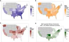 Differences among states, where different proportions of people self-report as mixed race, might explain some regional differences in genetic ancestry. However, we note that, first, proportionally fewer people identify as mixed race than as a single identity, and second, it remains important to establish regional differences in genetic ancestry of self-reported groups even if these differences are driven, to some degree, by regional changes in self-reported identity. More work is needed to determine to what extent regional differences are a result of how people today report their ancestry. Lastly, when available, we excluded individuals who answered “No” to a question whether they are living in the US. In total, our final sets included 5,269 African Americans, 8,663 Latinos, and 148,789 European Americans.