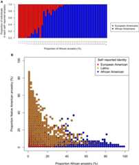 In the present work, we do not include individuals who self-report as having multiple identities, because this represents only a small fraction of individuals in our data set. Low rates of reporting as multiracial or multiethnic is in line with previous studies; an analysis of the 2000 US Census shows that 95 percent of blacks and 97 percent of whites acknowledge only a single identity.45 Future studies including multiracial individuals might further illuminate patterns of genetic ancestry and the complex relationship with self-identity.