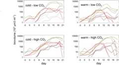 The phytoplankton succession during the experiment took the typical course of transient autumn blooms in Kiel Bight, when after extended vertical mixing in Kiel Bight surface concentrations of nitrate, phosphate and silicate are saturating for algal growth and calm and sunny conditions permit a growth pulse of phytoplankton. Hypothesis 1 (lower biomass under warmer conditions) was confirmed while hypothesis 2 (higher biomass at higher CO2) was only partially confirmed, in our case for the warm mesocosms. The temperature effect agrees with a suite of spring experiments performed in the same mesocosm system [22,27,33] and a similar experiment in coastal waters of North Carolina [34,35]. However, one summer experiment using the Kiel mesocosm produced the opposite result [36]. The usual explanation for the temperature effect is a stronger increase of top-down factors (zooplankton grazing) with warming than of algal growth, because of the temperature-insensitivity of light limited photosynthesis [27,34,35]. The CO2-effect is consistent with the assumption that CO2 might be occasionally limiting for phytoplankton growth, while it is inconsistent with the assumption that CO2 is a stressor for the local phytoplankton community.