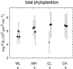 Means over entire experiment calculated after loge-transformation and standard deviations (vertical lines). Mesocosm is 9 shown by an open symbol. Treatment codes: WL: warm, low CO2, WH: warm, high CO2, CL: cold, low CO2, CH: cold, high CO2; codes for homogenous groups according to Tukey’s HSD: a, b.