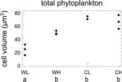 Response of community mean cell size (calculated from mean total biovolumes divided by mean cell numbers for each mesocosm) to the experimental treatments, mesocosm 9 shown by an open symbol. Treatment codes: WL: warm, low CO2, WH: warm, high CO2, CL: cold, low CO2, CH: cold, high CO2; codes for homogenous groups according to Tukey’s HSD: a, b.