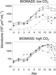 The weakness of a CO2 effect on the dominant species agrees with an experiment at the Azores where differences in the relative biomass of dominant between the acidified and non-acidified treatments was usually <10% of total biomass. [17]. Contrary to a previous study [20] found a slight negative effect of CO2 onChrysochromulina sp., this effect was not found for mean values in our experiment, but the decline ofChrsochromulina spp. during the final sampling intervals in the low CO2 treatments might hint in the same direction. Overall weak effects indicate similar adaptations to CO2 among the species coming from an environment with high natural CO2-fluctuations [21]. We cannot exclude that a stronger CO2 manipulation could have led to stronger effects, but it would have been beyond the atmospheric CO2-enrichment predicted for the end of the 21st century even in the pessimistic IPCC-scenarios.