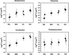 Size response of 4 selected phytoplankton species to the experimental treatments, means and standard deviations (vertical lines) based on measurements of 20 cells per mesocosms. Mesocosm 9 shown by an open symbol. Treatment codes: WL: warm, low CO2, WH: warm, high CO2, CL: cold, low CO2, CH: cold, high CO2.
