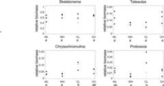 The relative biomass of the two dominant higher taxa, diatoms (grand mean 83% of total biomass) and cryptophytes (grand mean 10.5%) did not respond to warming and acidification. The relative biomass of prymnesiophytes (grand mean 4.7%) responded negatively to warming, while the relative biomass of dinophytes (1.5%), pico-chlorophytes (0.6%) and pico-cyanobacteria (0.14%) responded positively to warming. Dinophytes responded also negatively to acidification and showed a significant interaction effect between temperature and CO2. The other higher taxa did not show any significant response to CO2 (Table 1).