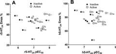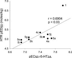 Functional potencies at the rat and human 5-HT2A and5-HT2C receptors and the human 5-HT2B receptorare shown in Table3. Compound1 was a nearly full agonist at both receptor types, with a 4.2 nMEC50 at the human 5-HT2A receptor and 11 nMEC50 at the rat 5-HT2A receptor. The most potentcompound was5a, with an EC50 of 1.9 nM and85% efficacy at the h5-HT2A. Notably, this compound hastheN-2-methoxybenzyl substituent, the same as themost potent phenethylamine1, suggesting that it maybe optimal for activation of the 5-HT2A receptor when placedat the 2-position of theN-benzyl moiety. Efficaciesof the tryptamines at the rat and human 5-HT2A receptorsand human 5-HT2C receptor varied from about 40% to 80%,with a few compounds that were full agonists (e.g.,5a and5c), whereas at the rat 5-HT2C receptorall of the compounds were full agonists.